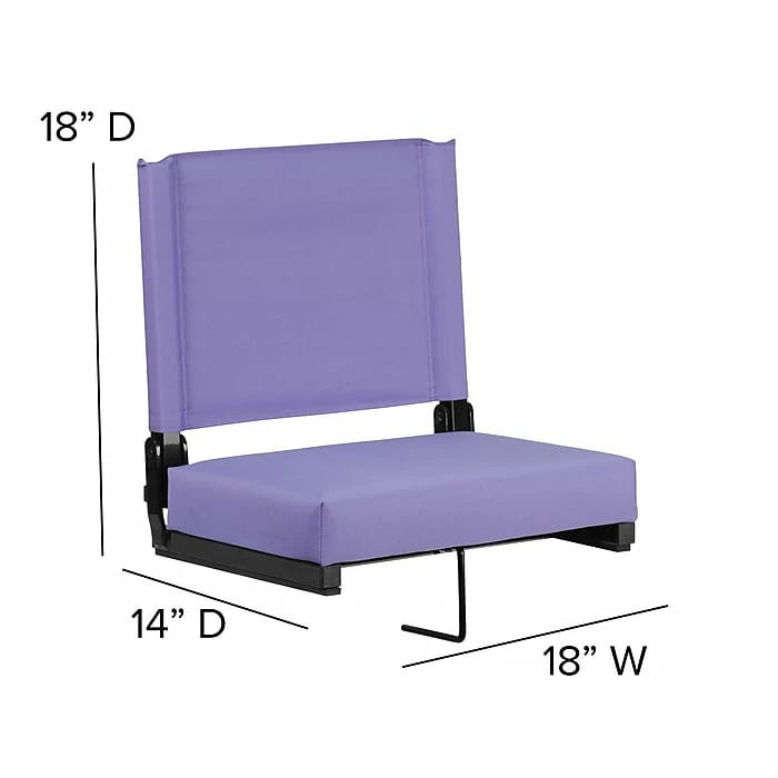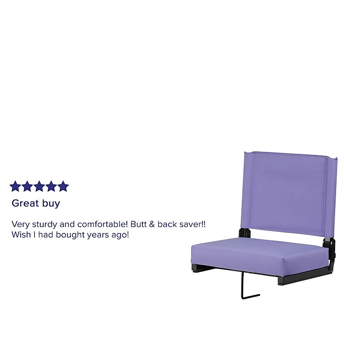 Love your team but hate those bleachers? Ever feel like you’re the one who got tackled when the game’s over? Now there’s a better way! Watch the game from the comfort of your Ultra-Padded Stadium Chair. Compact and portable folding chair with a built-in carrying handle and sturdy grip, this stadium seat is the lightest of its kind. Weighing in at a mere 7.6 pounds, this amazing seat can support up to 500 pounds to accommodate most users. With its 3 inch foam seat, you’ll be so comfortable you won’t want the game to end. If you’re worried about safety this padded stadium chair features rubber strips on the bottom to prevent the seat from sliding. A built-in bleacher hook provides added stability when sitting on wooden and metal bleachers and easily pivots out of the way to sit on the ground. Did you jump up to cheer and forgot you had your drink or nachos in your hand? Fear not, this bleacher chair can be spot cleaned with a wet cloth, for tough stains use a solvent based cleaner. Not just for game day, take your game day chair with you when you go camping, to the beach, and to outdoor concerts.