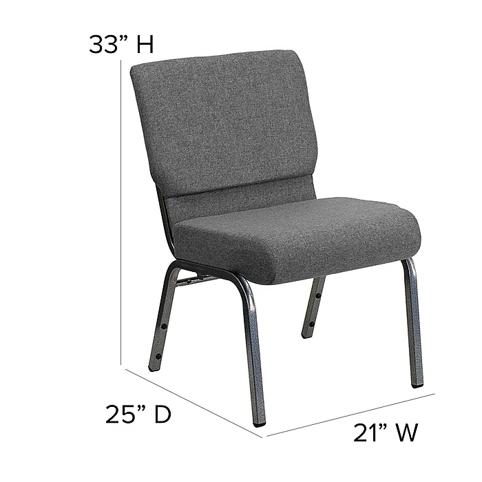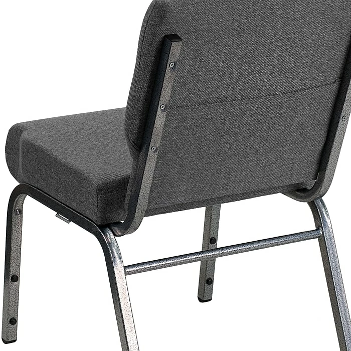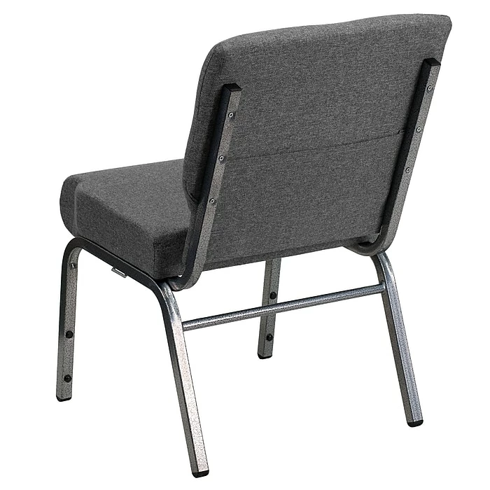 Flash Furniture HERCULESâ„¢ 21” extra wide Stacking church chair is gray fabric upholstery made with 3.75” thick seat and silver vein frame finish. Chair with ganging clamps has waterfall seat that reduces leg strain.