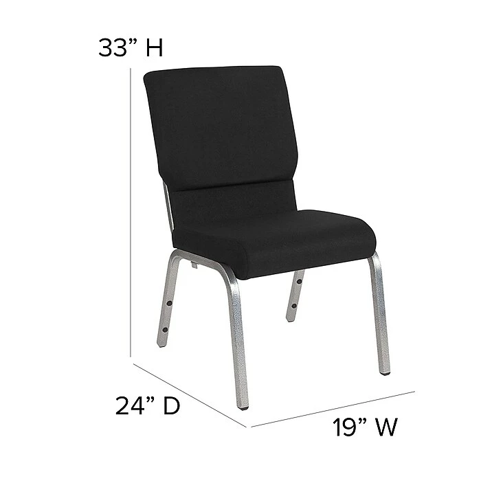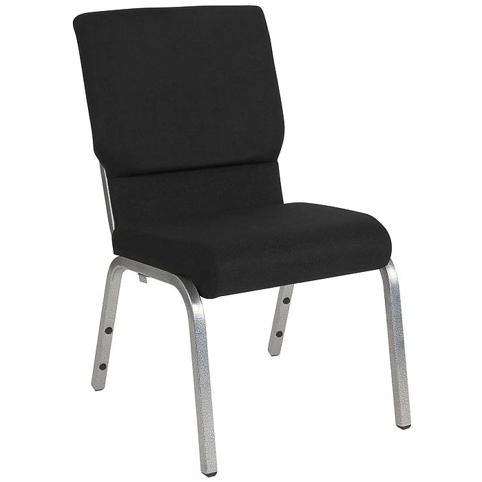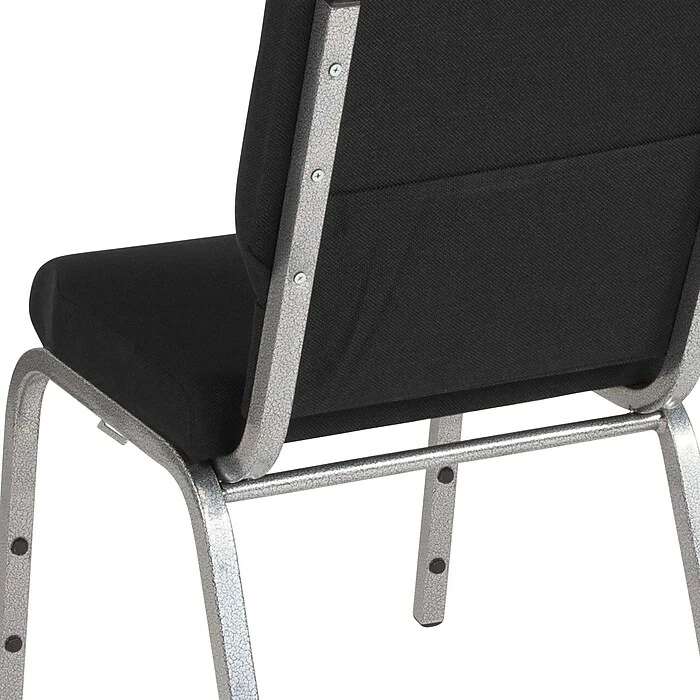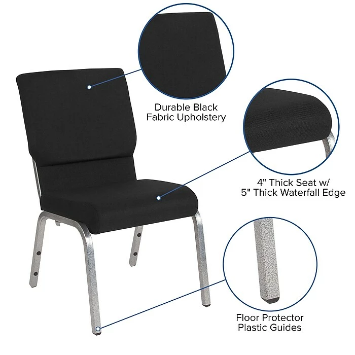 Flash Furniture HERCULESâ„¢ Series black fabric stacking church chair has a 4 1/4″ thick seat with a waterfall edge to minimize strain on the legs. Chair has silver vein frame finish and plastic floor glides to prevent floor damage.