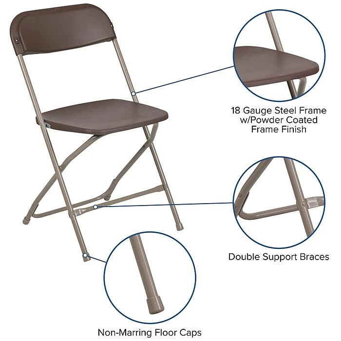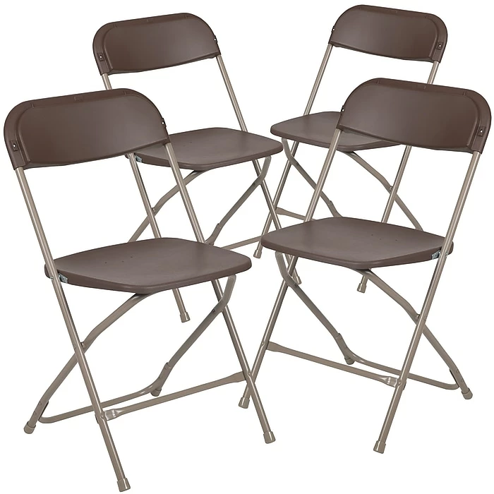 Commercial-grade plastic folding chairs designed to be lightweight but durable. This product is engineered and built with premium materials that will withstand heavy duty use for event, business and home usage. These folding chairs will nest easily to stack 50 high from the floor and feature a textured contoured plastic seat for the highest level of comfort and security. With a variety of color options you can choose what would best pair with your event needs. This is a commercial-grade on-demand seating solution convenient for weddings, school functions, barbecues, game night, and catering events. Stay comfortable during social events with the gentle contour shaped seat and back. Folding chair highlights: – Ready-to-use with no assembly required – Hassle free stackable storage – Textured seat designed for maximum comfort and security – Floor caps to prevent surface and flooring damage – 650LB weight capacity These low-maintenance party event chairs wipe down easily after luncheons and stack neatly for storage or floor maintenance. Make a smart investment by purchasing multiple plastic folding chairs for your rental business, waiting room or corporate training rooms. Purchase our folding chair truck for quick and easy set up and take down.