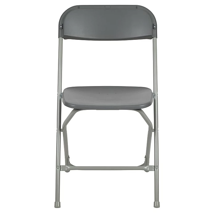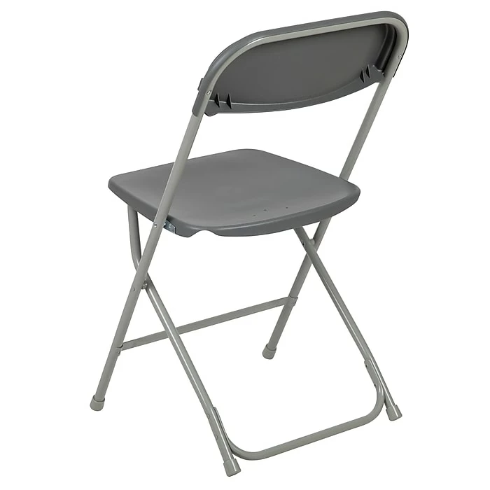 - Gray plastic chair with an 18-gauge powder-coated steel frame