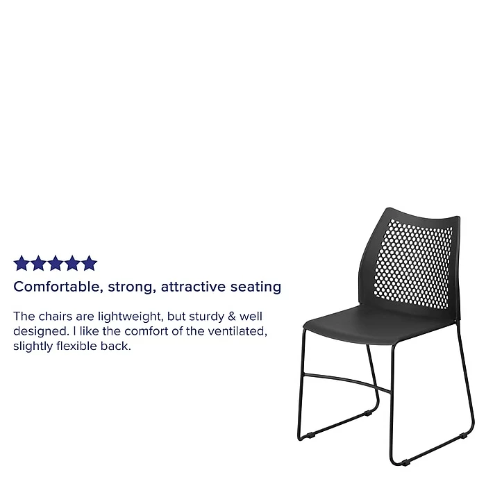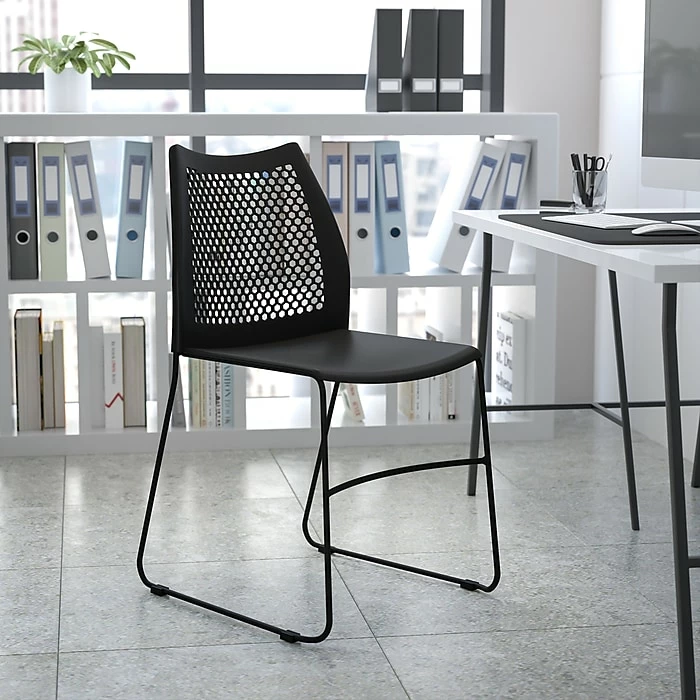 Grab the attention of visitors when they step into your meeting space and see these smart looking guest chairs. This modern beauty features a fully perforated back to provide airflow during conference hall meetings. Designed for versatility this chair is designed for reception areas, school functions, break rooms, cafeterias, event spaces and express emission testing locations where customers must get out their vehicle. Always be ready for guests by having several plastic guest chairs tucked away in your home. If you work in grungy environments and need a chair that is easy to clean plastic stack chairs are ideal. Store or transport up to 5 chairs on our compatible steel sled base stack chair dolly. When in need of a space-saving seating solution that is permanent or temporary, allow this stackable side chair to work for you.