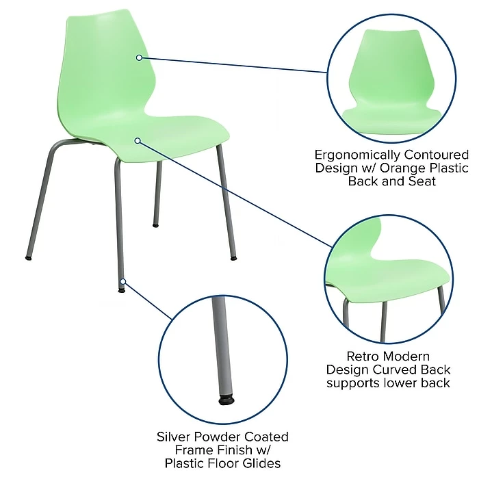Flash Furniture Hercules series stackable chair in green color is made of durable polypropylene seat and supportive front cross brace. 10576 oz chair features plastic floor glides and convenient ganging floor clips.