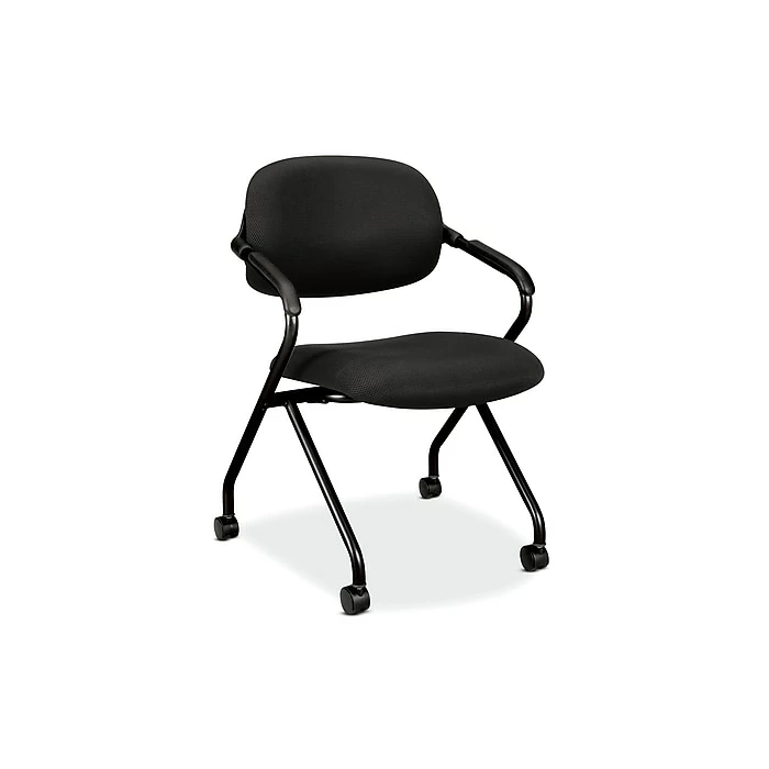 The upholstered folding seat and four legs with casters make this chair easy to transport and store. Mesh fabric color is Black and frame color is Black.