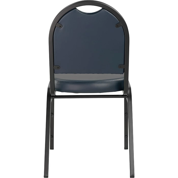 The 9200 Dome-Back stack chair is durable and classy enough to use in your busiest social setting, be it a dining room or corporate banquet hall. It features a strong square 18-gauge steel frame plus an under-seat H-shaped brace for extra support. The seat features supremely comfortable and spacious 2″-thick high-density foam padding with easy-to-clean vinyl upholstery or institutional grade fabric, and a waterfall-style edge. Plywood core within both the seat and rounded backrest which has a built-in handle for easy moving and stacking. Fortifying stacking bars and twelve plastic bumpers protect the powder-coated paint finish from scratches when the chair is stacked (up to ten units high).