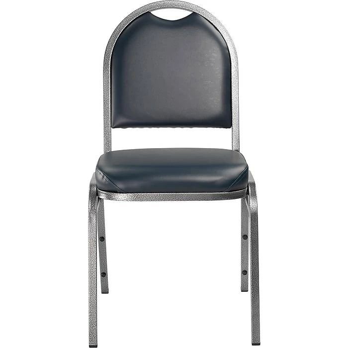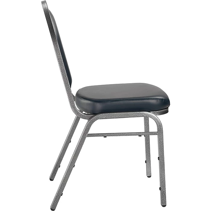 The 9200 Dome-Back stack chair is durable and classy enough to use in your busiest social setting, be it a dining room or corporate banquet hall. It features a strong square 18-gauge steel frame plus an under-seat H-shaped brace for extra support. The seat features supremely comfortable and spacious 2″-thick high-density foam padding with easy-to-clean vinyl upholstery or institutional grade fabric, and a waterfall-style edge. Plywood core within both the seat and rounded backrest which has a built-in handle for easy moving and stacking. Fortifying stacking bars and twelve plastic bumpers protect the powder-coated paint finish from scratches when the chair is stacked (up to ten units high).